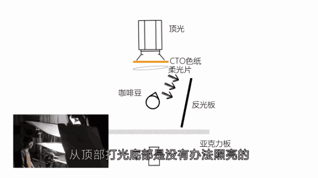 我们把咖啡豆放置在黑色亚克力板上,顶部架设了镝灯作为主光源。
