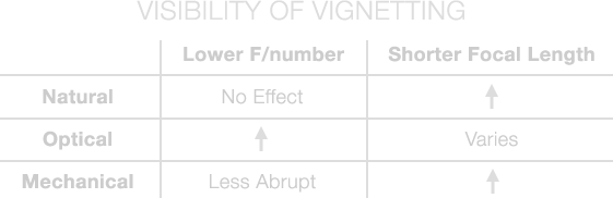 光学暗角的渐变同样也很平缓,但是它形成的主要原因是由镜头的固有特性,或者由镜筒自身的阴影造成。光学暗角也最终决定了一个镜头的成像圈的尺寸。这种暗角多在使用大光圈的情况下出现,并且受特定的镜头设计的影响很大。