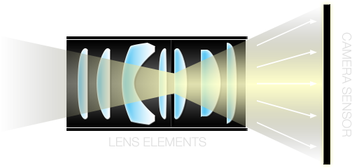 光的角度的变化之所以会造成弧形的渐暗是因为以下三个原因。第一,打到传感器边缘的光要比打到传感器中央的光途经的距离更远,这也就造成了光在途经的过程中就逐渐变暗,就像你在使用影室灯的时候将它放置的远一些的时候。第二,就像每天正午太阳在头顶的时候紫外线强度最大一样,照射在相机传感器上的光通量由中心向四周递减。第三,被镜头捕捉到的光线最终会呈现成椭圆状,因而,当达到一定角度的时候,就会变窄。