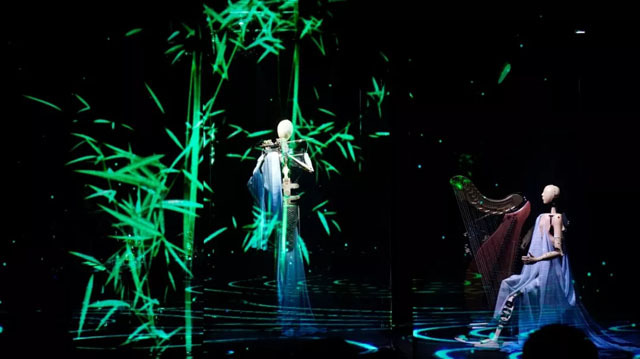 “墨甲”机器人“乐师”衣袂飘飘,各具风姿。伴随着弹奏而出的悠扬曲调,荷花、竹林、小鹿等动态形象纷纷呈现眼前。他们演奏的乐曲全部是原创音乐,也都是由作曲家根据机器人演奏的特点为乐队量身打造的。