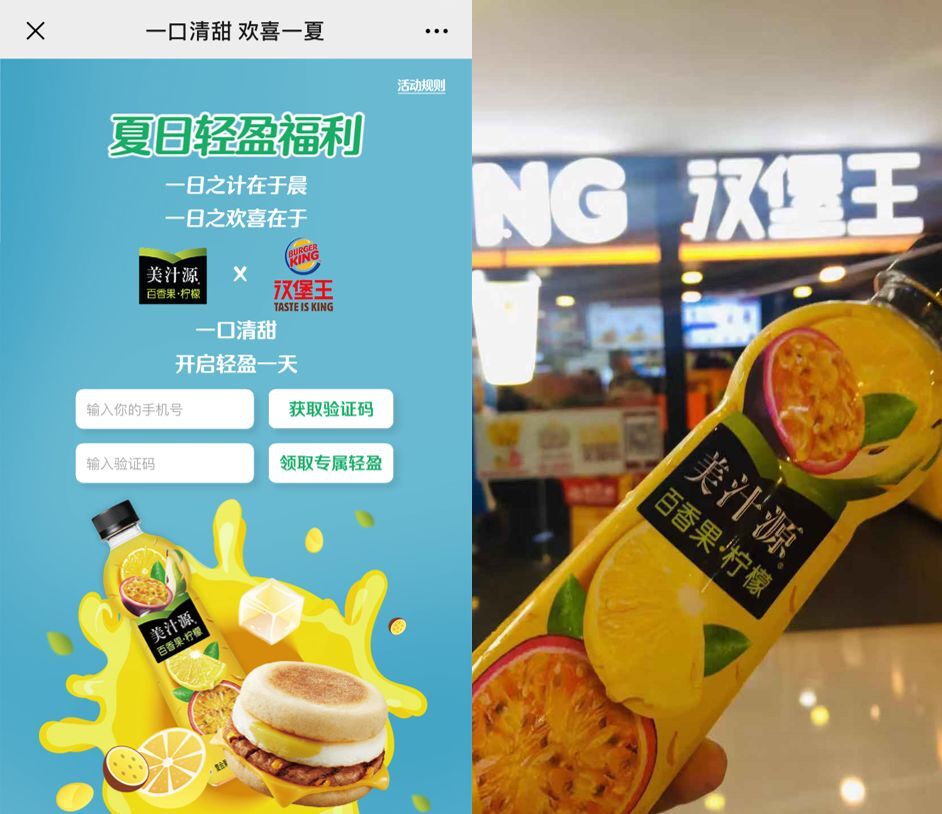 为了让更多人可以第一时间体验新品,美汁源又牵手汉堡王,借助这一连锁平台派样。结合早餐时段,绑定明星产品麦芬系列赠饮。同时在全国范围内六个城市的各大门店开启活动,在指定福利活动页面领取兑换券,即可获得美汁源百香果柠檬果汁,新品直达,让更多人尝鲜。
