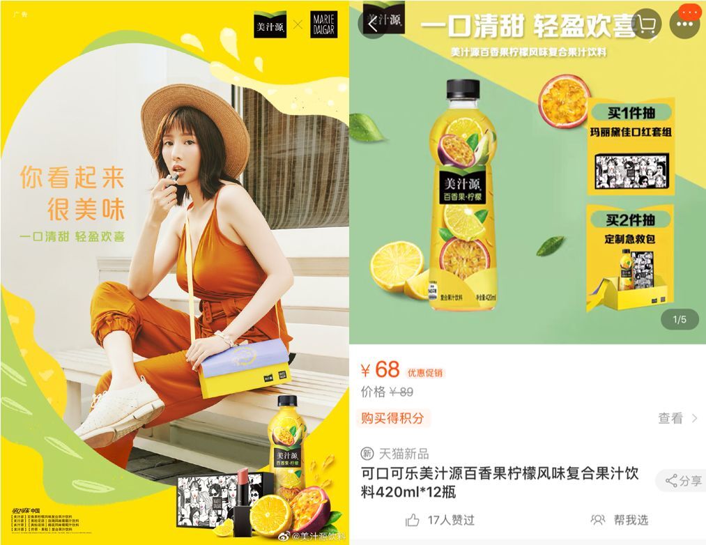 在这个炎热的夏天,借助全民职场狂欢节的热潮,美汁源新推出的夏日百香果柠檬新口味还特地联合当红国货美妆潮品玛丽黛佳玩起品牌跨界,为爱美女生备好美汁源定制急救包作为特别礼物,急救包中一盒口红负责扮靓,一瓶美汁源负责回血,高温天气下随身携带,潮包大牌既视感,一口清甜,轻盈欢喜,真实诠释什么叫“你看起来很美味”。
