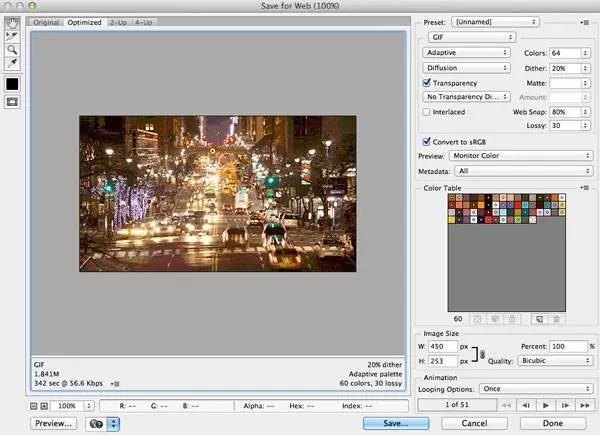 另存为网页对话框将做的工作对我们来说,一旦你选择GIF文件格式作为输出。请注意,动画的选项将显示在对话框的右下角。如果你决定要进一步减少图像的大小,你仍然可以在这里调节。