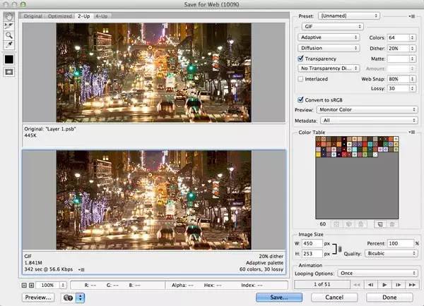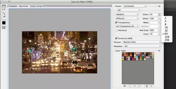 最相关的选项,以优化一个GIF文件的大小是在色表使用的颜色数量。颜色的最大数量为256,这是从8位深度的限制。一般来说它是很好的坚持使用64色或更低,但根据原视频,你可能需要增加的颜色数量,以获得更好的结果。