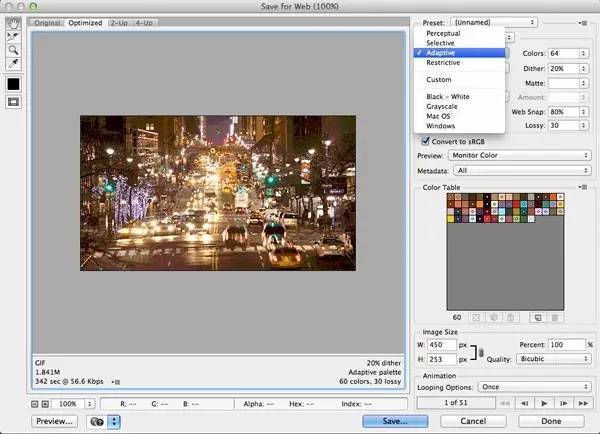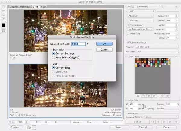 如果你已经有预设,看看你在浏览器中预览选项最终GIF,不要忘了将设置保存为预设。您也可以从优化菜单此附加选项指定的文件大小限制,一旦该应用Photoshop将尝试用最佳的图像质量,以适应大小。