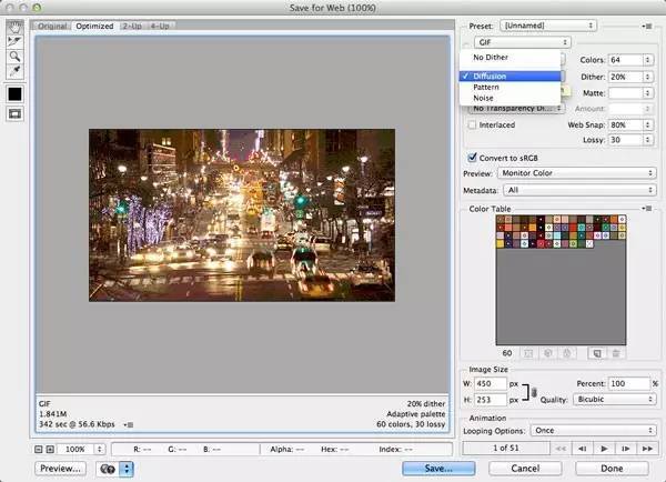 由于GIF文件包含的颜色数量有限,我们可能想模仿缺色,用抖动是可行的。从“抖动”菜单中,我们选择的算法之一。“扩散”的方法让我们调整抖动量。随着“模式”和“噪音”的算法有调整。越抖动的图像中,较大的文件抖动的越大,