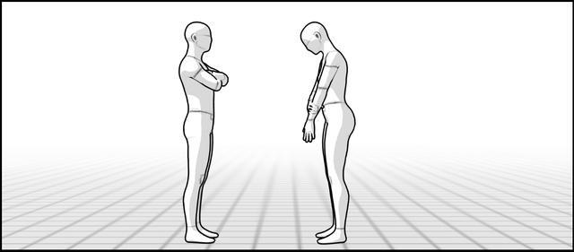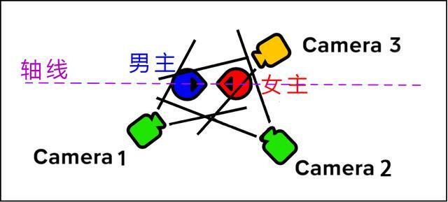 上图是角色人物与机位调度的顶视图,男女主正面对话,当确定了第一台机位1拍摄女主时,那么在男女主之间就形成了一条轴线(紫色虚线),而拍摄男主的第二台机位就必须在这条线的同一侧,剪辑出来的镜头是这样的: