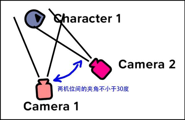 30度法则是指针对一个人物(或主体)的前后两个机位镜头的剪辑,前后两镜头机位之间所形成的摄角要不小于30度,否则,画面的剪辑过渡就会不流畅,观众会有“跳”的感觉。当然,为了特殊效果,也有故意为之的影片案例,但同样要慎用。下图参考: