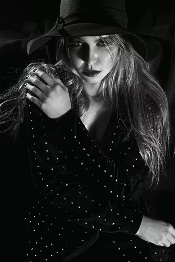 深色系的衣物加上较低的曝光量可以营造低调人像画面。为了避免画面暗部的层次尽失,在拍摄时用了两个方向的光源,营造出一种立体感,并适当照亮照片的暗部,显示出暗部足够多的细节。