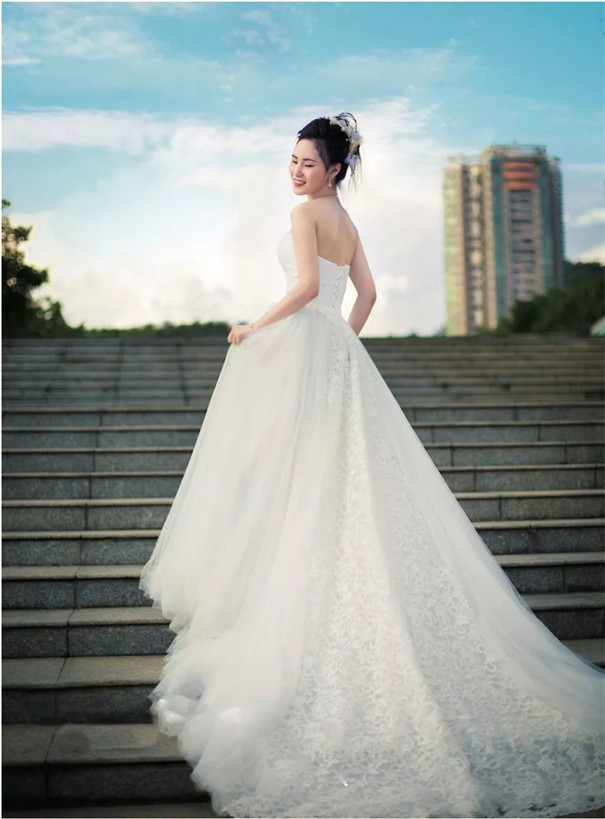 拍摄婚纱,城市广场是非常好的选择。这张照片中规律分布的台阶让画面有一种韵律美,显得非常大气。