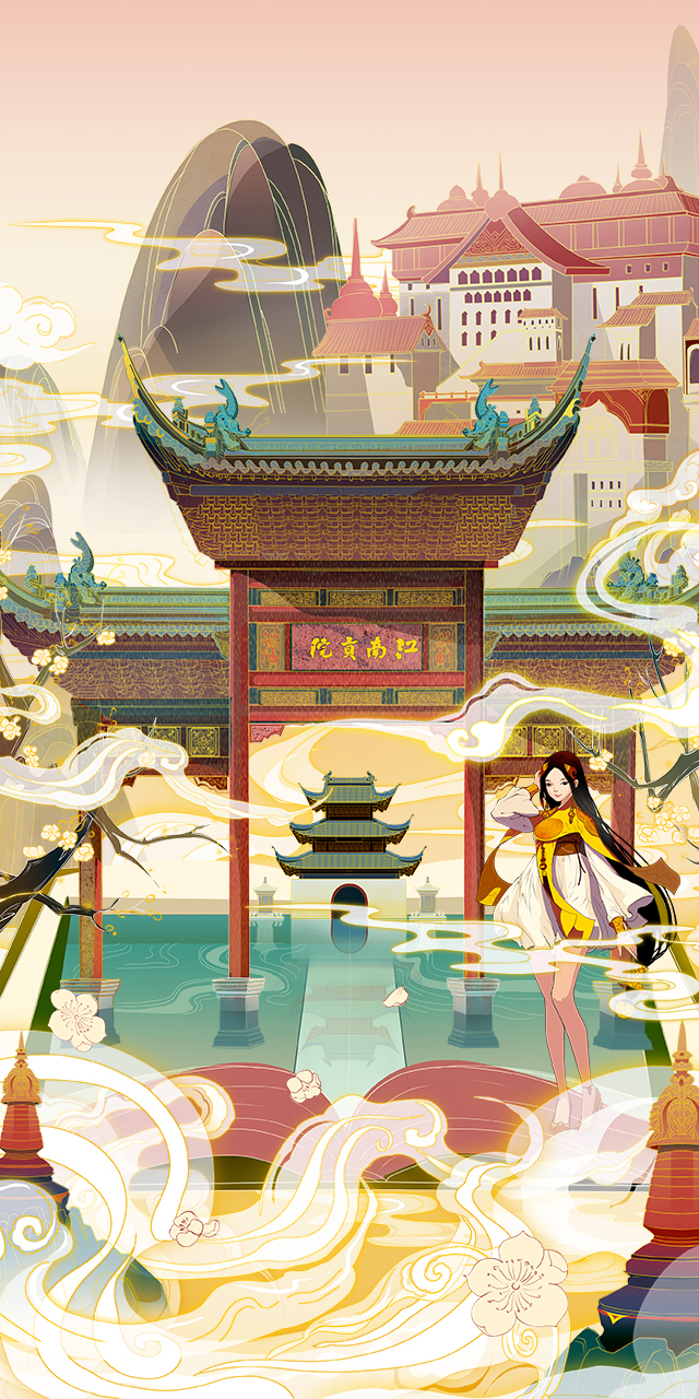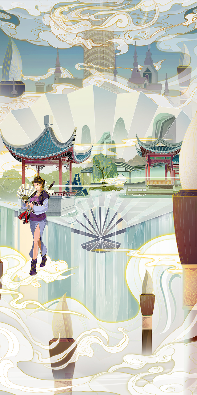 秦淮风光的展现,游戏人物和南京地标性建筑的融合,色彩的搭配,无不考验着插画师的功力;而在此作品中便可窥见一斑。