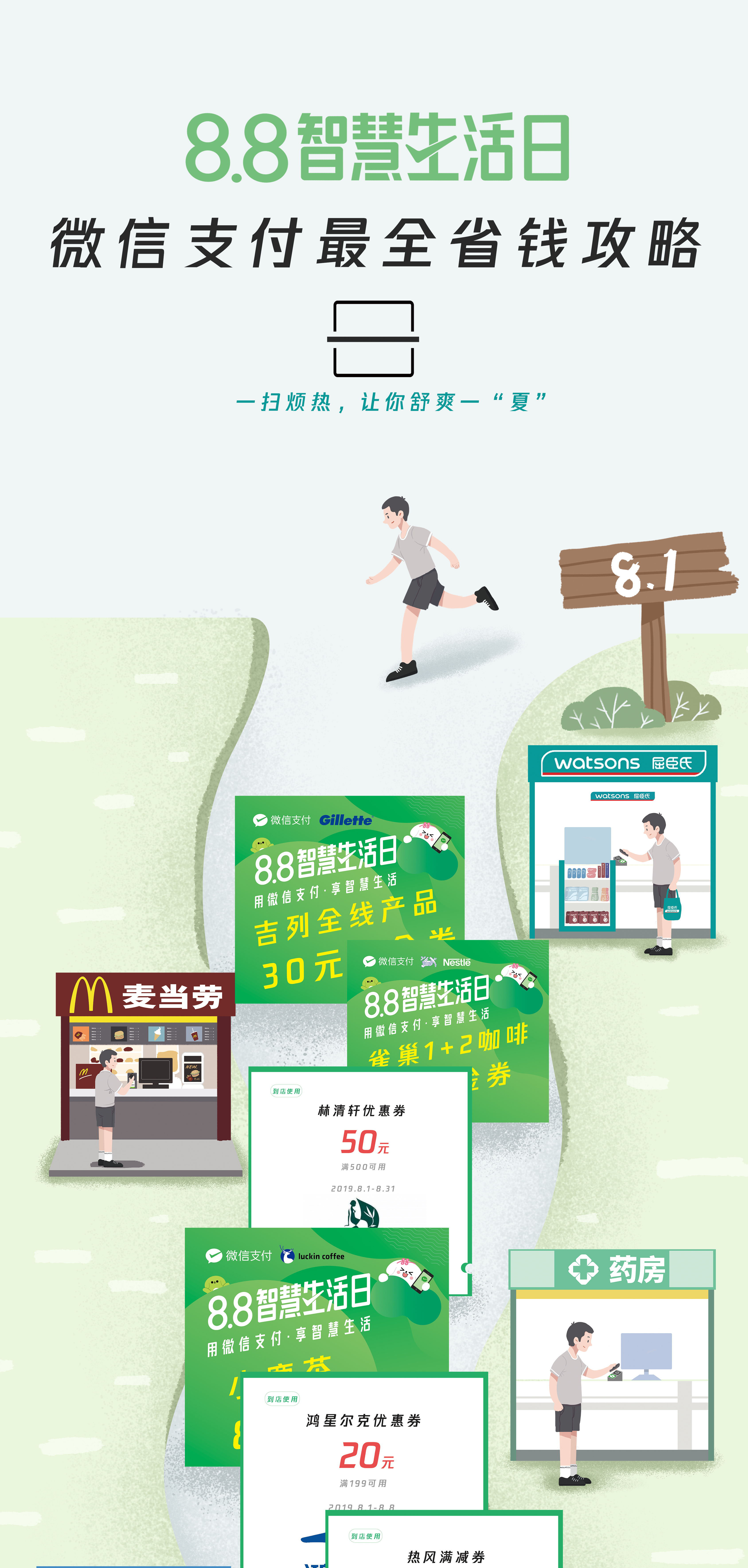 8.8智慧生活日是由腾讯微信支付发起和倡导的全球首个移动支付节日,号召全行业携手助力传统行业数字化深度转型,把新技术、新能力、新应用实实在在地落到具体生活场景。