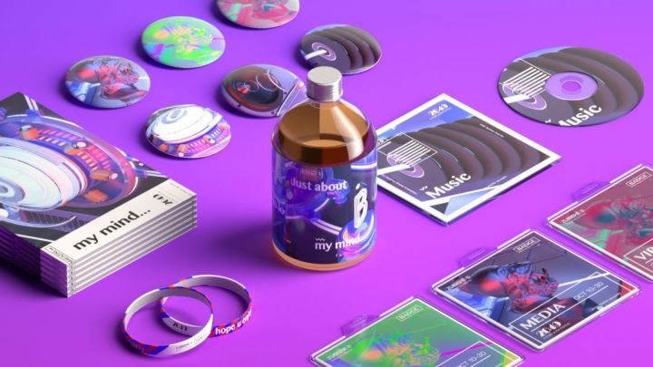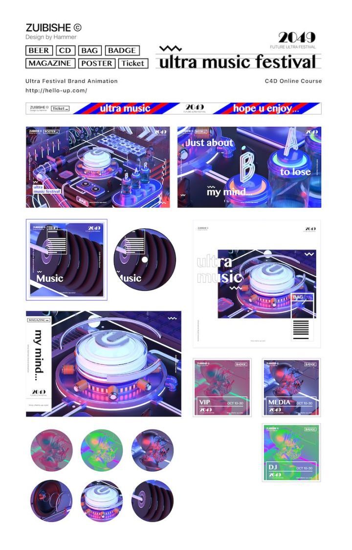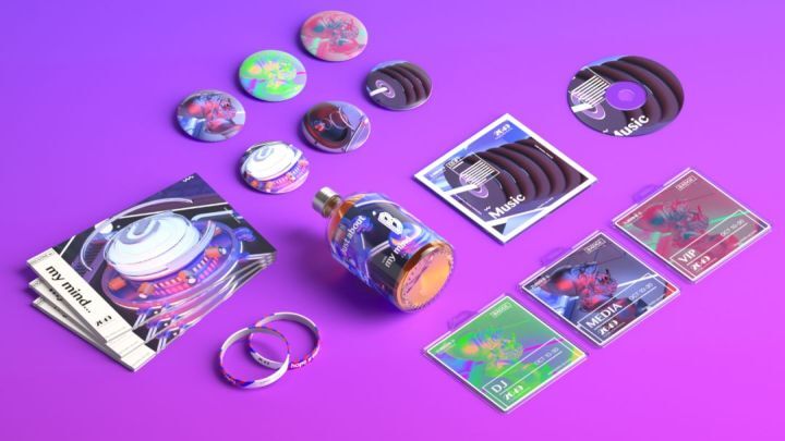 在三维画面的基础上结合一些简单的版式设计以及一些必要的文字内容,就可以很轻松地延展出一整套品牌 VI 视觉衍生物。