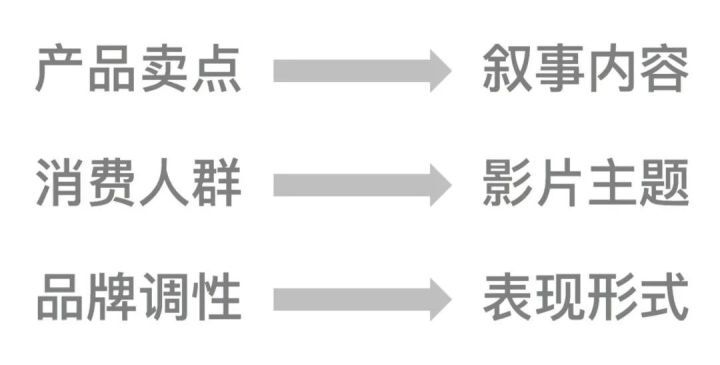 产品卖点在设计时可以支持叙述内容的创作,消费人群会决定影片主题,品牌调性则决定了表现形式。