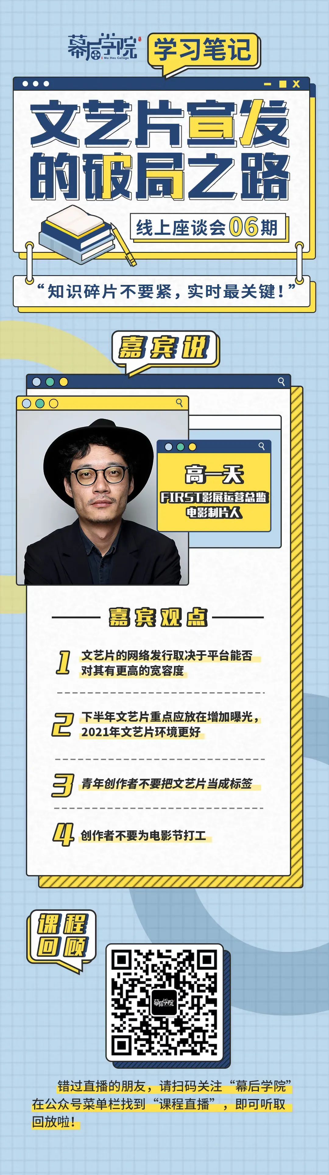 为此,我们联合幕后学院,于3月12日推出主题为“文艺片宣发的破局之路”的线上座谈会,对话嘉宾黑鳍影业创始人王子剑,前景娱乐创始人黄茂昌,和FIRST影展运营总监高一天。