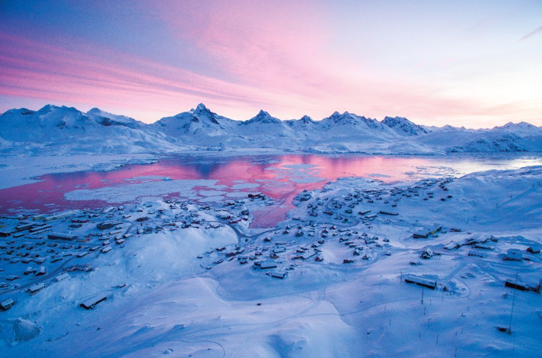 “东格陵兰岛是世界上最偏僻、最荒凉的地方之一。参差不齐的山脉和深邃的峡湾间满是巨大的冰山……这一切构成了一处真正别具一格的迷人景观。每当太阳从塔西拉克湾升起时,天空一片绯红,大地尽染。伫立于格陵兰岛之上,一日看万色。”