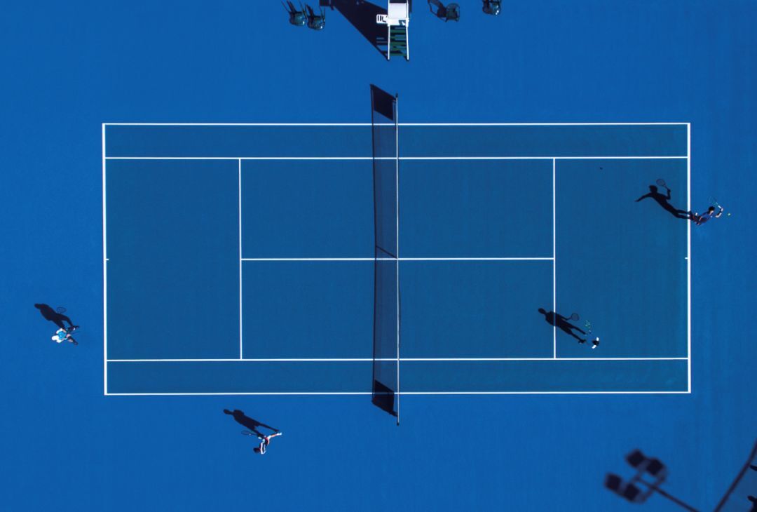 “网球场内场和外场之间醒目且微妙变化的蓝色,以及其与干净的白色线条形成的鲜明对比深深吸引着我。当时天气晴朗而温暖,太阳的高度足以创造出一定比例的阴影,使得我们可以从另一个维度看出球场上球员的形体。我拍了 5 幅影像,最终选了这幅作为最佳框景结构的影像,因为其中展现了发球球员的身姿。”