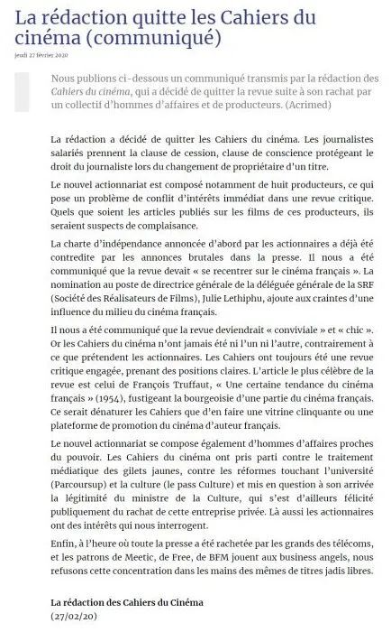 这是《电影手册》历史上第一次编辑部全员离职,原因是新股东对杂志的独立性可能造成威胁。辞职声明中指出,新股东成员包含八名制片人,对以批评为主的杂志造成了明显利益冲突,同时编辑部被告知,应当“重新聚焦法国电影”,以及更“友善”以及更“时髦”。因拒绝杂志被装点成鼓吹法国作者电影的浮夸橱窗和推销平台,以及未来发表任何关于这些制片人股东的电影评论都难脱谄媚的嫌疑,《电影手册》的编辑部于法国当地时间2月27日,发布全体辞职声明。目前《电影杂志》管理层还未对编辑辞职一事做出回应。早在本月初,据AlloCiné报道,这本法国老牌电影杂志被20位电影界的影迷联合收购,并成立名为“手册之友”的公司。同时,Éric Lenoir将担任《电影手册》的经理人与指导。《电影手册》的新管理团队还表示,之后杂志将增加电子版,以及开设"大师班"播客等等有关新媒体的内容。今年一月份,《电影手册》公布了2019年度的十佳片单,其中获得戛纳金棕榈奖和奥斯卡最佳影片奖的《寄生虫》、获得威尼斯金狮奖的《小丑》和获得柏林金熊奖的《同义词》均有入围。《电影手册》是法国影评人安德烈·巴赞等人创办于1951年4月,意欲通过电影批评来引导、教育大众接受艺术与美的熏陶。巴赞决心成为一名真正的电影评论家,仅在手册上就发表过116篇文章,同时也不遗余力在各地组织活动,推广电影。1958年巴赞去世以后,《电影手册》被交到一群年轻编辑手上:让-吕克·戈达尔、弗朗索瓦·特吕弗、克劳德·夏布洛尔、雅克·里维特……《电影手册》素来是一本高度介入、表明立场的批判性杂志。其最著名的评论当属弗朗索瓦·特吕弗的《法国电影的某种趋势》(1954),抨击了法国电影的部分资产阶级,实际成为法国新浪潮运动的理论宣言。几年后,他拍出了惊世处女作《四百击》。影评人们纷纷转向创作,形成知行合一的独特风潮,成为世界影史影响最深远的一次美学运动。早期《电影手册》就有主张独立电影、激进政治的倾向。五月风暴前后,特吕弗、戈达尔发起抗争运动,欲改变法国电影工业样貌,《电影手册》成为后援基地;1970年代取消主编,进入集体创作时代;受当时中国的影响,手册日益意识形态化,内部还曾成立过“革命文化战线”及“鲁迅小组”。直到今天,《电影手册》仍不愿随波逐流,保持着鲜明立场,每年的关于年度电影的十佳评选,都成为了观众选择、观看电影的重要依据。《电影手册》仍致力于在全世界搜寻和挖掘有才华的导演。“年度十佳电影”是《电影手册》每年的重头戏,上榜的影片丰富、类型多样。笔者介绍的十年百部佳片就是汇集了《电影手册》10年来评出来的作品。在其中每部电影资料详细,导演生平和剧情、影评、主演、获得奖项、剧照,这些令读者对影片有了相当的印象。这本册子对专业人士而言可作为参考“资料”收藏,对于影迷而言是不错电影指南。至少可以了解法国电影人是以何种视角观察世界电影。《电影手册》常设的栏目主要有“作者研究”、“影片分析”、“导演访谈”,以及对许多不同的民族国家电影所做的深度报道。“作者研究”是该杂志以每期一个重点人物的形式推出的,这些人物不但有电影史中已成经典的大师,比如费里尼、伯格曼、帕索里尼等人,也有为新近去世的大师推出的纪念专辑,比如库布里克和布莱松专题;同时还有对正在创作的电影导演进行的专题性回顾,比如阿莫多瓦专题,或是北野武专题。进入这个栏目的作者既有以拍摄艺术片而确立自己地位的电影家,也有在好莱坞商业电影领域中独领风骚的电影导演,比如吴宇森。“影片分析”栏目的重点是针对重要导演的新作进行评析。影评家对电影史上一些重要影片所撰写的重要评述文章,很多都来自这个部分。比如对《筋疲力尽》、《妈妈和妓女》的介绍,都曾引起极大反响。该栏目也对电影史中的一些经典之作进行回顾式的评介,比如对雷诺阿影片的介绍,我们几乎在每个时期的《电影手册》中都可以看到。“导演访谈”是对正在拍摄新片的重要导演作现场采访。在其中我们经常可以看到马丁-斯柯塞斯、伍迪-艾伦、阿兰-帕克、王家卫等人的面孔,而他们的肖像也会经常出现在该期杂志的封面上。1999年12月,《电影手册》杂志现任主编夏尔-戴松来到北京,带来了与这本杂志的发展历史密切相关的几部电影作品,在北京电影学院进行了名为“《电影手册》杂志周”的专题放映,引起很大反响。而此前,他们还在上海调查中国电影状况,并将成果发表在《电影手册》题为“中国国产”的专辑上。他们对中国新生代导演的创作也表现出极大的兴趣,同时对港台电影也多有介绍。历经70年,《电影手册》催生了法国电影新浪潮运动(1958~1964),发掘了大量的电影新导演,以其鲜明批评方针,不妥协敢言的姿态,在当今电影届独树一帜,在欧美及至世界影坛都有深远的影响力。而它与中国电影界的关系似乎才刚刚建立起来。如果说我们以前对法国电影只能是“遥望”,那么今天,我们也许有机缘对此前我们一直陌生的东西认真地“近观”。这带给我们的,无疑是欣喜。而全体编辑辞职这件事不仅将终结《电影手册》自2009年开启的德洛姆时代,甚至可能引发这本全球首屈一指的电影杂志历史上最大危机。这也意味着这群资历深厚的老编辑