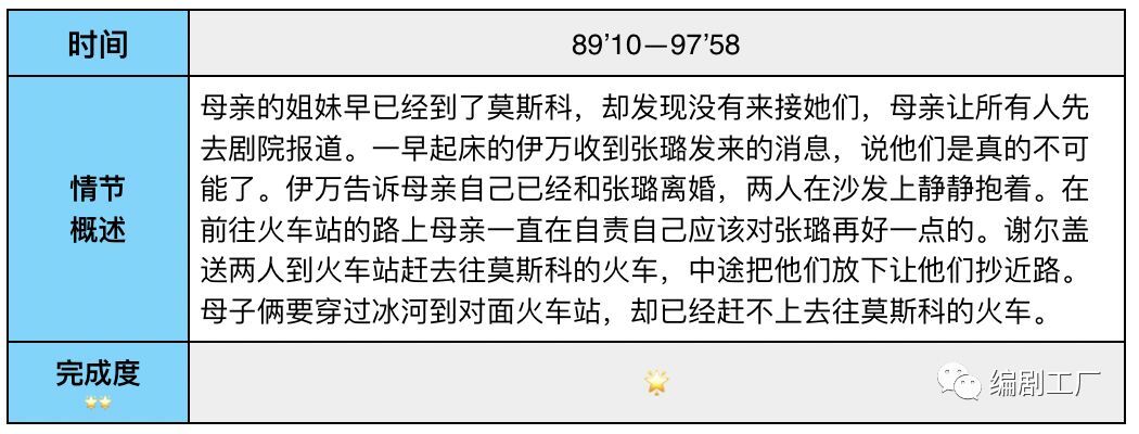 分析:影片在处理“一无所有”和“灵魂黑夜”的情节时,错置了不同功能属性的情节,编剧将张璐提出分手的情节放在“一无所有”处,将母子俩赶不上去莫斯科的火车放到了“灵魂黑夜”处,可尝试将这两个情节置换位置,因为“一无所有”这一节拍点必须是作用在“A故事”,即“前往莫斯科”这条线索上的事件,因此应该先构建早上醒来,谢尔盖送母子到冰河边,母子未能赶上火车,徐伊万决定“前往莫斯科”的计划破碎,陷入最黑暗期。