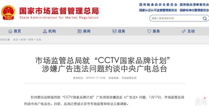 2019年1月17日,国家市场监督管理总局针对“CCTV国家品牌计划”广告用语涉嫌违反《广告法》问题约谈中央广电总台,并责成北京市市场监管局依法立案调查。