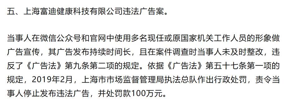 2019年,上海富迪健康科技有限公司因使用多名国家机关工作人员的形象做广告宣传,被罚款100万元。