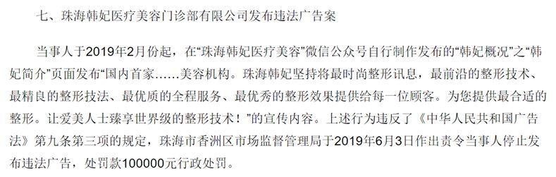 2019年,珠海韩妃医疗美容门诊部有限公司发布包含“国内首家”、“最前沿的整形技术、最精良的整形技法、最优秀的整形效果”、“世界级的整形技术”的宣传内容,被罚款10万元。