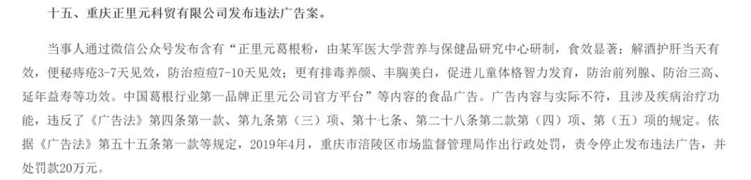 2019年11月,重庆正里元科贸有限公司发布含有“中国葛根行业第一品牌”等内容的食品广告,被罚款20万元。