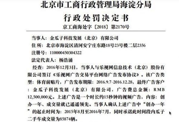 2018年11月15日,金瓜子科技发展(北京)有限公司因在广告中使用瓜子二手车“创办一年、成交量就已遥遥领先”的不实宣传语,被罚款1250万元。