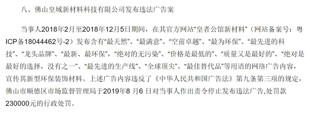 2019年,佛山皇域新材料科技有限公司发布含有 “龙头品牌”、“绝对的无污染”、“价格是最低的”、“质量又是最好的”、“绝对是最好的选择,没有之一”、“全球顶尖”、“最佳替代品”等用语的广告,被罚款23万元。