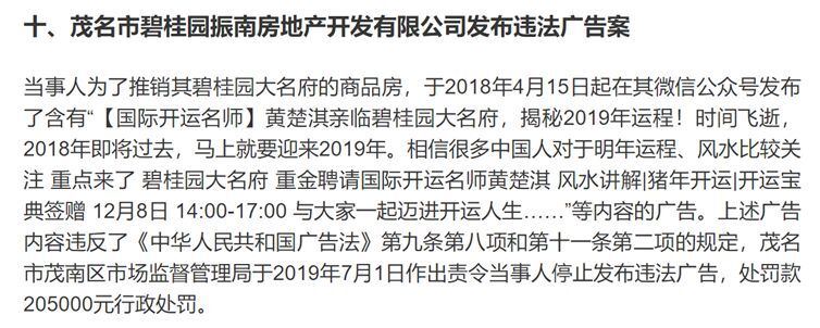 2019年,茂名市碧桂园发布“重金聘请国际开运名师黄楚淇风水讲解、猪年开运、开运宝典签赠”的广告,因涉及迷信内容被罚20.5万元。