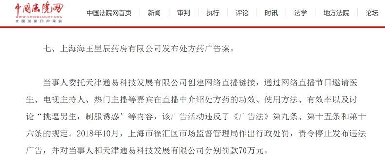 2018年6月15日,上海海王星辰药房有限公司因开展“有球必硬夜夜激情”网络直播活动,被依法处罚款70万元。