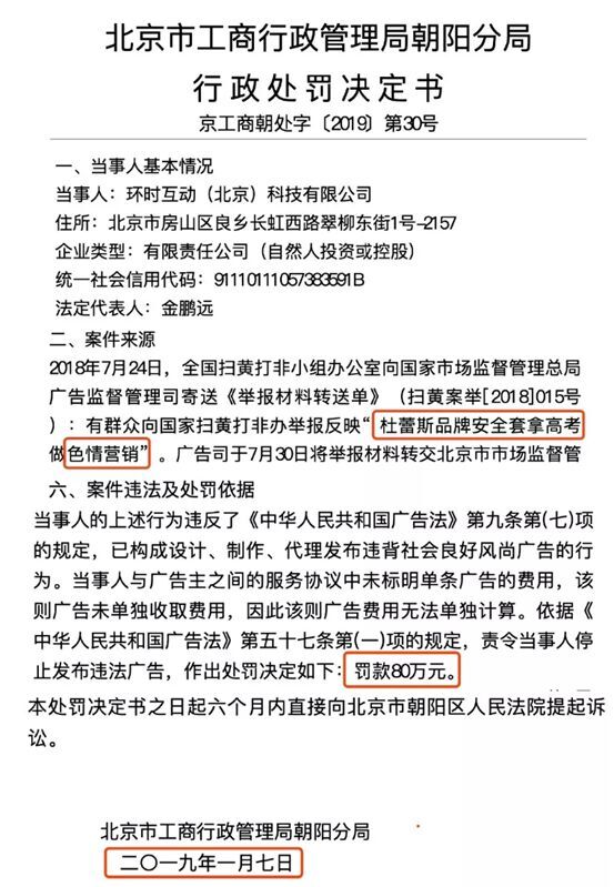 2018年7月24日,环时互动因为杜蕾斯品牌做高考软色情营销,被罚款80万元。