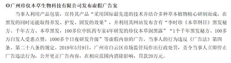 2019年,广州珍仪本草生物科技有限公司发布含有“千年古方”、“黑发秘方”“让你一生拥有永久黑头发”等内容的虚假内容广告,被罚款20万元。