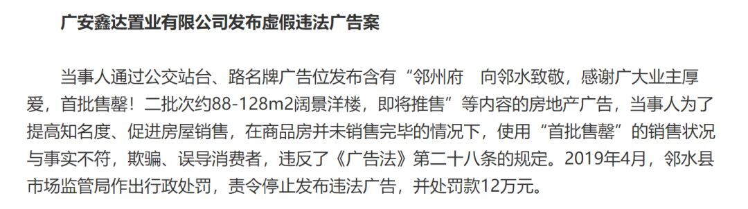 ⊙ 违法案例22-广安鑫达置业:“首批售罄”被罚