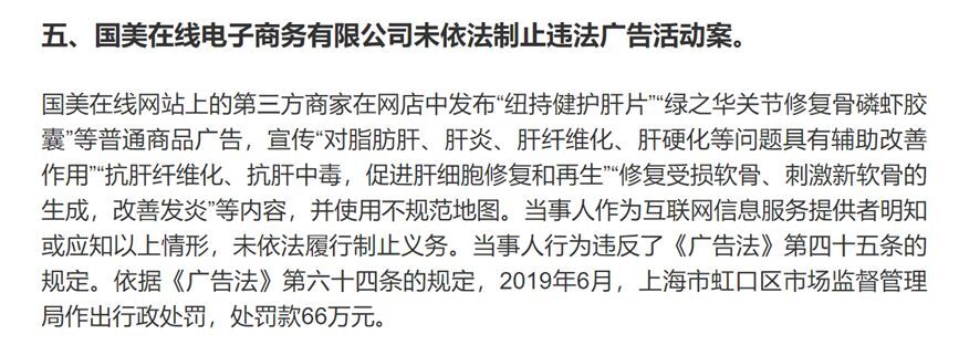 2019年12月12日,国美在线网站上的第三方商家在网店中发布宣传有治疗功效的普通食品违法广告,国美在线未依法履行制止义务,被罚款66万元。