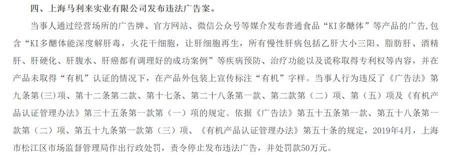 2019年12月,上海马利来实业有限公司因虚假宣传普通食品“KI多醣体”具有疾病预防、治疗功能的广告,被罚款50万元。