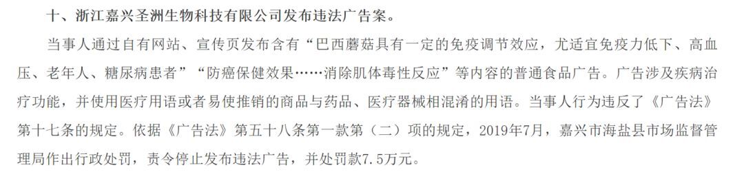 2019年,浙江嘉兴圣洲生物科技有限公司因发布涉及疾病治疗功能、使用医疗用语的普通食品广告“巴西蘑菇”,被罚款7.5万元。