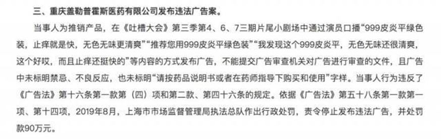 2019年12月17日,999皮炎平因在《吐槽大会》第三季第4、6、7三期片尾小剧场中通过演员口播广告,但未标明禁忌、不良反应,也未标明“请按药品说明书或者在药师指导下购买和使用”字样,被罚款90万元。