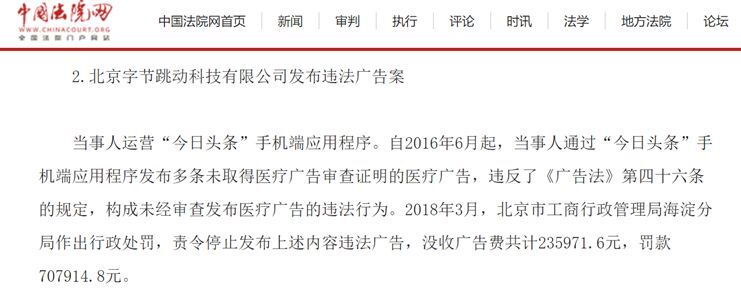 2018年3月,今日头条APP因发布多条未取得医疗广告审查证明的医疗广告,被没收广告费23万余元,并罚款70.79万元。