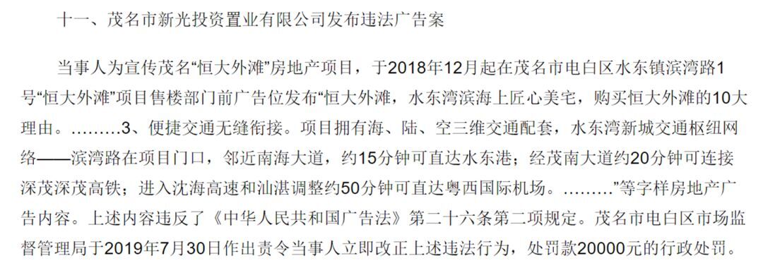 茂名市新光投资置业有限公司因发布“滨湾路在项目门口,邻近南海大道,约15分钟可直达水东港”、“经茂南大道约20分钟可连接深茂深茂高铁”等内容的广告,被罚款2万元。