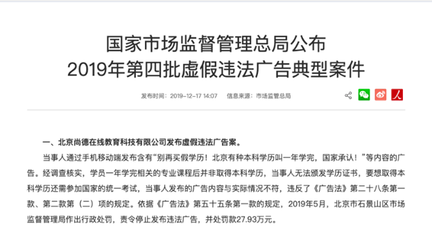北京尚德在线教育科技有限公司在广告中宣称“一年学完,国家承认”,实际无法颁发学历证书,被罚款27.93万元。