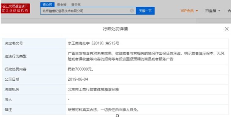 2019年6月4日,互联网金融垂直搜索平台融360母公司北京融世纪信息技术有限公司因含有“对未来收益进行保证性承诺”被罚款70万元。