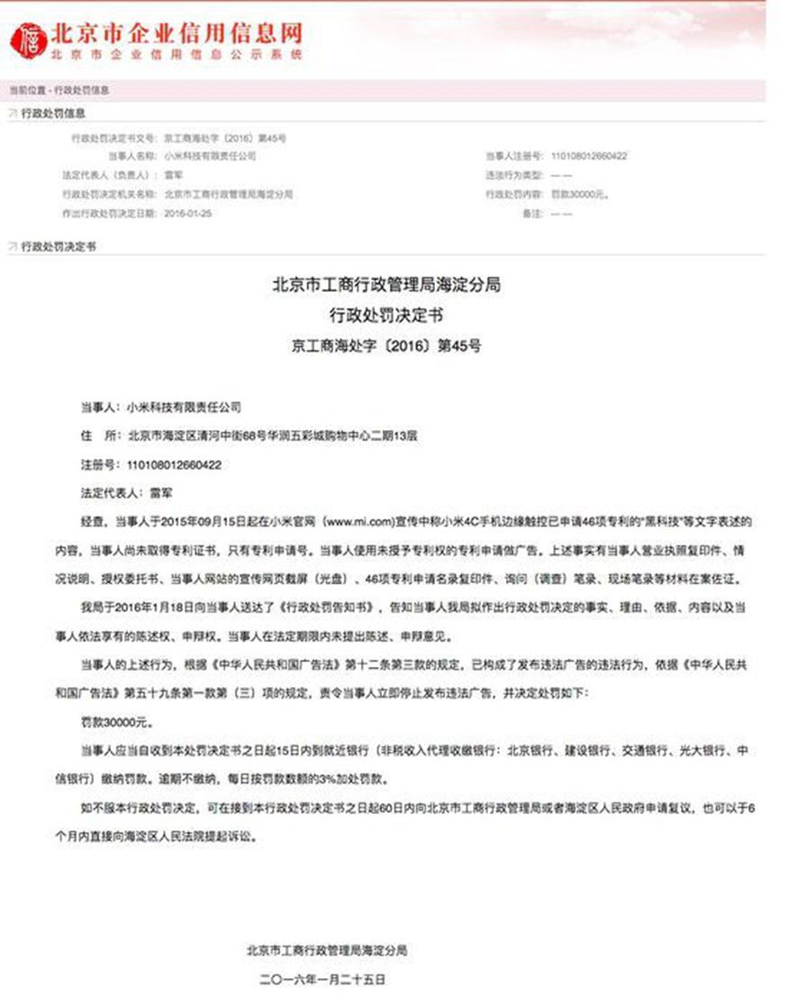 2016年1月25日,小米公司在官网出现“小米4C手机边缘触控已申请46项专利的”文字宣传,但其实专利没拿到,被处以3万元罚款。