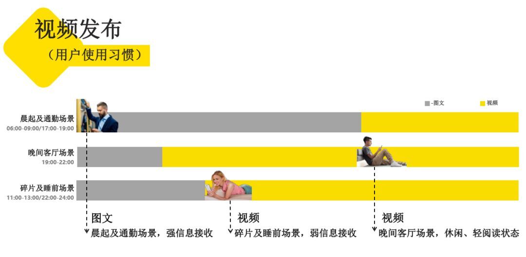 晨起及通勤时间(6点-9点,17点-19点)用户倾向于接收强信息,适合发布图文内容。碎片及睡前场景(11点-13点,22点-24点)用户倾向于接收弱信息,适合发布短视频。晚间客厅场景(19点-22点),用户处于休闲、轻阅读状态,适合发布短视频。