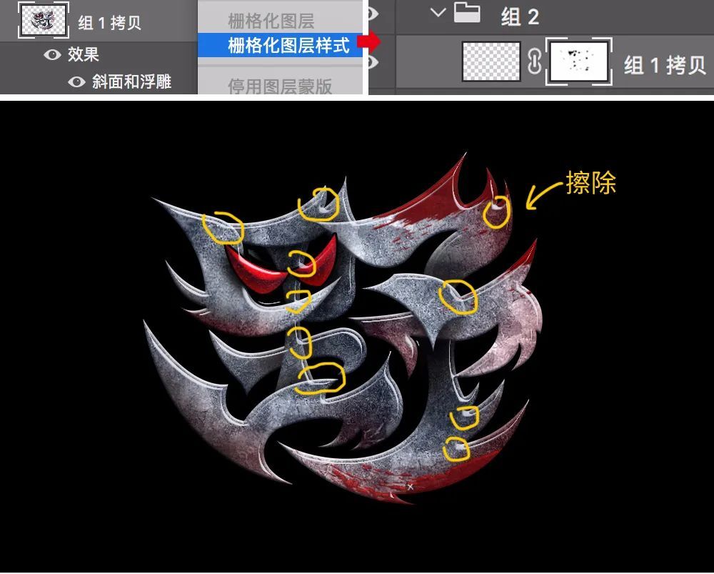 (2)然后再右击这个盖印出来的图层,选择“栅格化图层样式”,给图层添加蒙版,擦掉笔画与笔画连接处的高光,让整体的高光更自然。