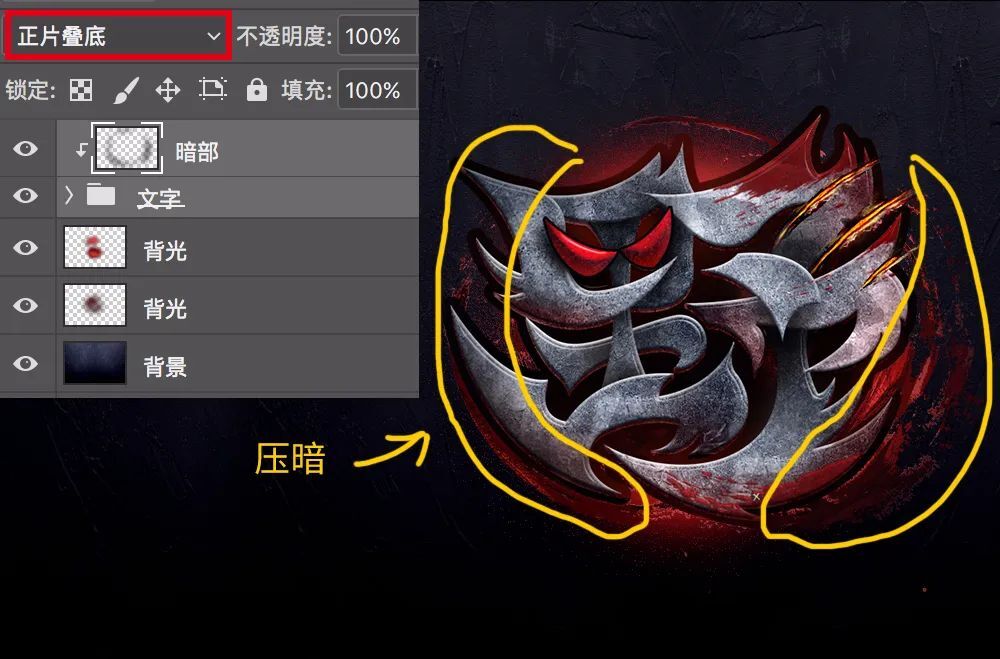 (3)再新建一层,放到“背光”层的上方,选择柔边画笔工具,色值#ce3c37,在靠近文字的边缘处,再加一层背光。