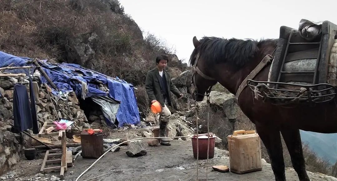 矿山一般都在偏远的大山里,上山的路都是矿民们一点点走出来的,而矿民们住的地方也是是用塑料彩条布和粗木棍搭建起来的,仅仅只能挡风挡雨,没有什么其它功能。矿山开采完就撤,因此没有哪个老板会因为开矿而专门修建一条道路和盖一座房子。而矿民们的生活也异常艰苦,由于交通不便利,他们每次上山务工都是一年半载也回不了一次家,所有吃的用的都是靠马驮上山,十天半个月都洗不了一次澡,冬天大山里寒冷无比,好几个人也只能围着柴火取暖。业余生活唯一的乐趣就是听一听上山前下载在手机里的歌,过年时能炒个小菜喝点酒,大家一起聊聊天,这就是大部分矿工的日常生活。
