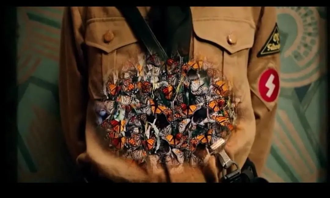在妈妈的教导下,乔乔被潜移默化的影响,最直接的表现就是她对艾莎的态度有了转变。可令人难过的是,没过多久,乔乔的妈妈就被吊死在街头。从乔乔的视角看,他首先看到一个美丽的蝴蝶,可他一转身看到的却是两只被高高悬吊的双脚,乔乔为母亲系好鞋带,抱着那双悬挂于空中的腿哭泣。也正是因为母亲的死,他心中的希特勒英雄也随即幻灭,当希特勒再次出现在他面前时,他一脚将希特勒踹出窗外。