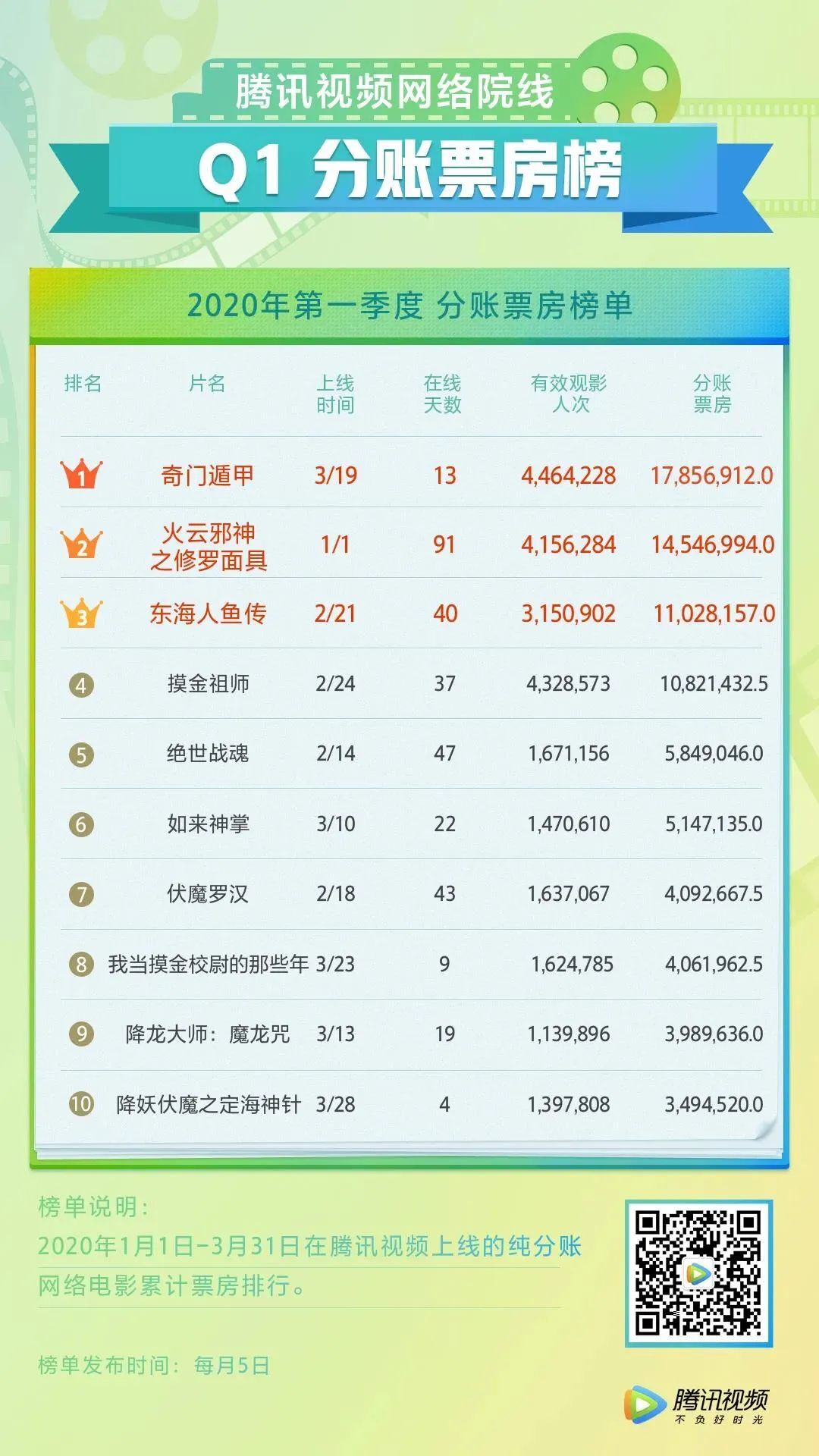 如果在2020年春节前,有人说网络电影千万级票房将成为常态,恐怕会成为行业内的一句玩笑。然而,随着7部春节档院线影片集体撤档,《囧妈》第一个吃了“院转网”的螃蟹后,玩笑离现实越来越近。以猝不及防之势走上舞台中央的网络电影轮番登场,迎来镁光灯照射下的“高光时刻”。据云合数据统计,2020年一季度全平台共上线196部新片,其中6部影片在双平台播出,190部影片在爱奇艺、优酷、腾讯视频、搜狐视频、西瓜视频、PPTV独播,市场竞争空前白热化。作为网络电影的最先尝试者,发行上具备更多经验的爱奇艺有92部独播新片上线,占据47%的市场份额,表现出强劲优势。分账票房数额,无疑是网络电影证明自身实力的最重要指标之一。令人欣喜的是,烹小鲜中国故事【鲜】锋榜一季度网络电影TOP10的所有上榜影片,分账票房均超过1000万。截止3月31日,荣登榜首的《奇门遁甲》分别在爱奇艺、腾讯视频收获2092万、1786万,累计3878万分账票房的傲人成绩,排名第十位的《灭狼行动》分账票房也达到1464.1万。从各大平台官方公开的1月、2月、Q1分账票房排行榜可见,仅2020年开年前两个月,已有14部影片票房突破千万。进入3月,爱奇艺接连出现《狙击手》(2038.1 万)《封神榜妖灭》(1480.8万)等新的爆款之作,破千万票房速度一再刷新。实行了新分账合作模式的腾讯视频,一季度也有4部影片分账过千万。要知道,爱优腾三平台2019年度分账超千万的影片才只有43部,2020年一季度已完成18部。需要说明的是,徐峥主演的《囧妈》大年初一免费播出,甄子丹主演的《肥龙过江》在2月以“单片付费”模式播出,按照云和数据有效播放计算,这两部院转网影片绝对是1月、2月当之无愧的票房冠军,但因为爱奇艺和腾讯均未公开其票房分账,顾并未统计在内。从2014年第一次提出概念,到2019年有了正式通用名的网络电影,对标“院线”的野心不言自明。这六年间,网络电影从吃流量的红利,吃题材的红利,到真正地花更多的时间在文本内容创作上,终极目的是突破题材单一的桎梏,摆脱群魔乱舞、怪兽当道之风。所幸这份努力有了回报,题材类型多点开花成为2020年第一季度最明显的变化。此次上榜的10部影片,细分来看,涵盖动作、武侠、奇幻、冒险、悬案、爱情等多种类型。动作元素取代怪兽风成为大热门,军事题材突出重围,历史英雄人物传递家国大义……当创作的触角不断外延拓展,网路电影也在无限向“电影”靠拢。全网炸屏的2020版《奇门遁甲》,是2017版徐克监制、袁和平执导的同名院线电影唯一正版授权拍摄的网络电影,原版《奇门遁甲》编剧、制片人魏君子也同时担任2020版《奇门遁甲》的制片人。从授权链到制作,都属于网络电影中的“高配”。《巨鳄岛》《法医宋慈》《火云邪神之修罗面具》三部影片则主打知名演员牌,无论是老牌港星罗嘉良、著名笑星潘长江,还是元华、元秋等《功夫》班底的重出江湖,都或多或少提升了网络电影的外在气质。而从云和数据提供的Q1全舆情热度排行来看,观众对一部影片的选择,演员阵容强不强是重要的参考依据。事实上,自《战狼2》《红海行动》等军事题材电影创造票房神话,引发轰动之后,网络电影在该题材的创作上,热情高涨。《狙击手》《灭狼行动》的抢眼表现,为行业注入信心。主旋律加特效的枪战场面,让上映4天的《狙击手》票房已突破850万,《灭狼行动》以1464.1万的成绩收官。烹小鲜中国故事【鲜】锋榜一季度网络电影TOP10上榜影片中,《辛弃疾1162》豆瓣评分6.3,系最高分。处于中游位置的《奇门遁甲》5.4分,《狙击手》4.5分,而《巨鳄岛》《火云邪神之修罗面具》的豆瓣评分仅2.8。个中原因,或许与网络观影体验、主流受众口味有关。但从另一角度看,票房与口碑不成正比,也势必制约网络电影的长远发展,至少豆瓣达到7.5以上,才能算是真正破圈的口碑之作。2020年第一季度,网络电影盈利模式上的创新,掀起行业浪花,“单片付费”开始进入主流视野。《肥龙过江》的投石问路,在某种程度上打破优质内容在“单片付费”这一模式上的顾虑,进一步推进网络电影to C市场走向成熟。撕开这个口子之后,网络电影在制作成本、宣发成本等方面的投入,将较此前更为大胆,据悉已有影片投资额达到3000万以上。随着3月5日腾讯视频首次公布网络电影分账榜单并升级合作模式,至此,爱优腾三大视频平台的网络电影板块终于全部实现了数据透明。各大视频平台的结算合作规则也随之做出新的调整,结算周期缩短至月结。月度结算的方案将于2020年4月正式生效,届时4月将按新规则结算Q1季度的分成,5月结算4月分成,以此类推。除此之外,爱奇艺还推出超前结算的业务,通过定向邀约的方式,票房宝会在影片上线前预支30%-50%的制作成本。结算方式的变化,对于网络电影这种短周期、低体量的产品而言,更利于内容方保持充足的现金流,从而顺利推进后续项目的运作,与各平台方实现资源、内容、营销等多个层面的共赢。春节过后,网络电影被官方频频点名,加速推进行业精品化进程。2月出台的剧本备案政策比院线电影更严,从源头抵制投机者入场的态度十分坚决。实际上,这已经不是第一次广电总局利用政策对网络影视剧行业进行大规模调整了。早在2019年初,广电总局对网络视听节目信息备案系统进行了升级,新增加了重点网络影视剧信息备案系