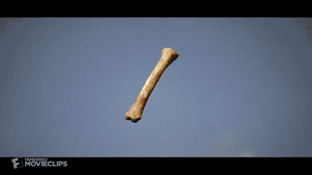 这一瞬的画面剪接,不但把故事舞台从远古的蛮荒之地,搬移至浩瀚无垠的外太空,亦借由骨头与太空船的对比,呈现人类文明跨越千万年的演变进程。